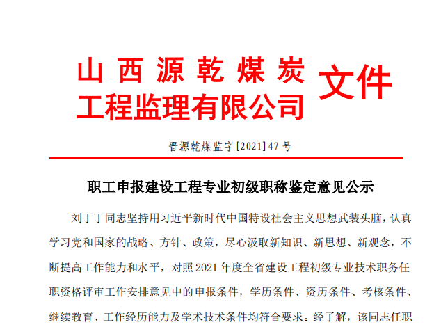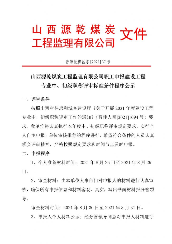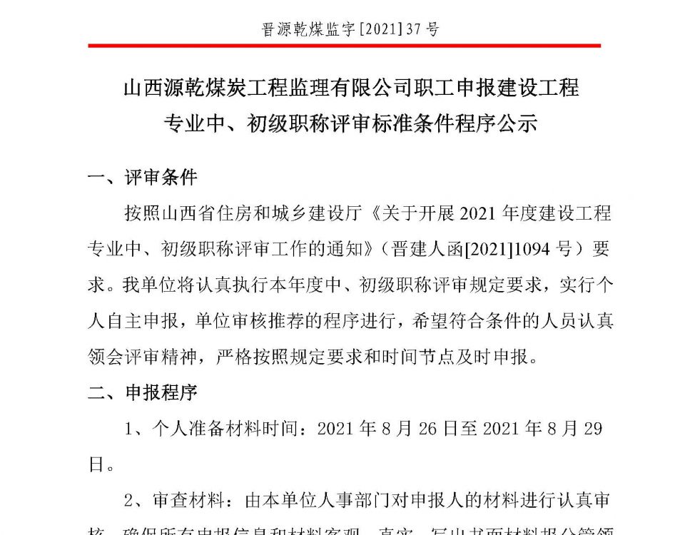 按照山西省住房和城乡建设厅《关于开展2021 年度建设工程专业中、初级职称评审工作的通知》(晋建人函[2021]1094 号)要求。我单位将认真执行本年度中、初级职称评审规定要求,实行个人自主申报,单位审核推荐的程序进行,希望符合条件的人员认真领会评审精神,严格按照规定要求和时间节点及时申报。