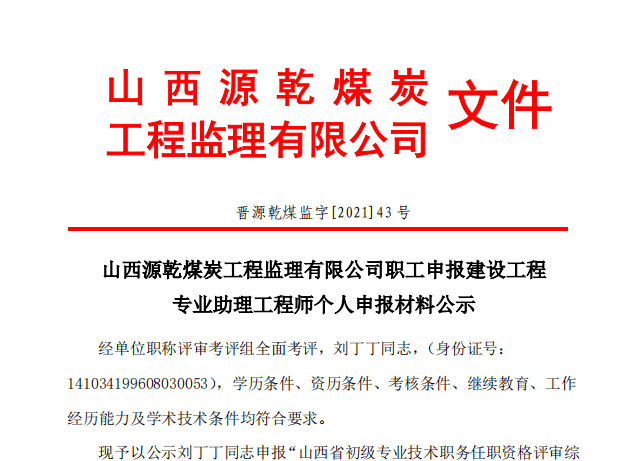 现予以公示刘丁丁同志申报“山西省初级专业技术职务任职资格评审综合考评表”接受群众监督。